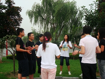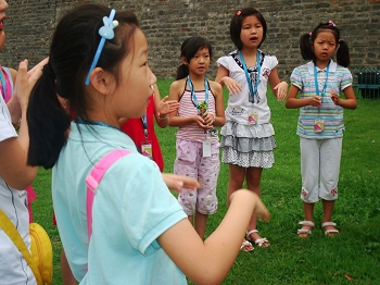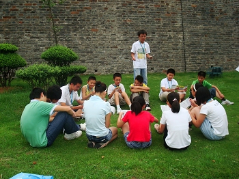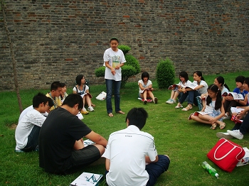 听!基础营的营员们在朗读咱们新东方为“市民学英语”活动编写的“市民英语五十句”。“Xiangfan is composed of three districts……(襄樊由三个区组成……)”,“You will have a good time in Xiangfan.(你在襄樊一定可以玩儿得很好)”,“The story of ‘Three Visits to the Hut’ happened in Gu Long Zhong.(刘备“三顾茅庐”的故事就是发生在古隆中)”……