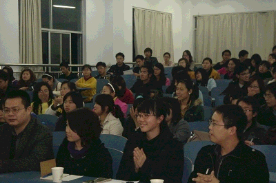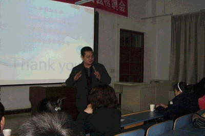 晚7时,襄樊学院阶梯教室里已是座无虚席。两位主持人介绍完本次招聘会活动环节之后,襄樊新东方青少部主管周丽老师第一个走上台来,开始了招聘项目的介绍环节。她用生动的幻灯片向大家介绍了新东方一路走来的成长历程以及泡泡少儿英语的品牌优势,随后又带领同学们一同欣赏了襄樊新东方青少部教师团队的靓丽风采。以周丽老师为代表的团队,他们身上典型的80后青春的气息,让在场的同学们耳目一新。