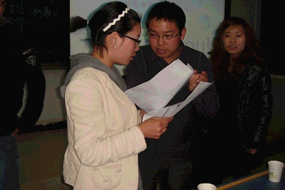 随后,进入现场招聘环节。应聘的同学首先填好简历表并抽取试讲题目,然后在休息区等候依次上台试讲。第一个走上台来的是应聘英语老师的,她的试讲颇有几分教师的风范。在随后的采访中,我们了解到,她是来自07级英语专业的曹玲,她表示虽然是第一个上台,但是心态很好,可是由于中间出现了一点失误,开始有些小小的紧张。在络绎不绝的应聘者中,还有一位同样是07级的来自机电一体化专业的男生。他叫刘春波,是学校里工程图学协会技术部部长,此次应聘的是数学老师。他说,虽然自己学的是专科专业,但是还是有信心能够胜任这样一份工作,因为他从来都只做自己有把握的事情。外表颇为干练的他,今年六月份即将毕业,为了实现自己“先择业,后就业”的梦想,他来到了这里应聘新东方的教师职位。
