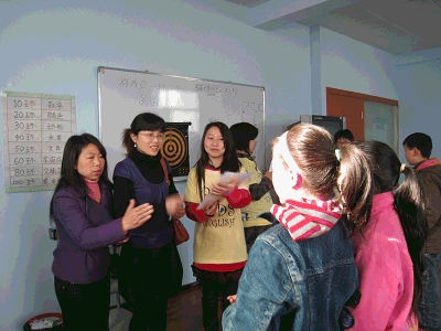 转身来到“一掷千金”的教室里,在家长们的默契配合下,飞镖拿了高积分,随后孩子们又用一个个准确的英语单词回答获得双倍积分,飞镖游戏与单词考验可谓融合得天衣无缝。