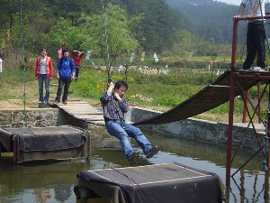 员工们不仅被黄家湾山环水绕,油菜花自然清新的美景深深吸引,对景区内开设的类似户外拓展的走滚筒、木头桥、吊桥等游玩项目,亦是乐在其中。